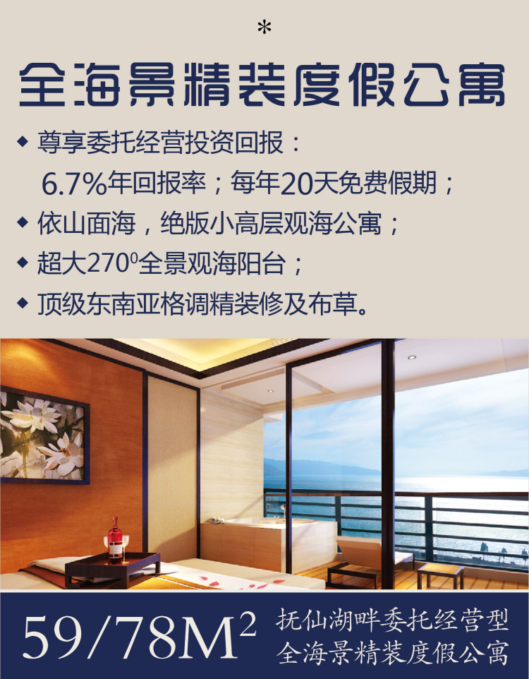 这是抚仙湖区域最后的小高层海景公寓,依山势而建,仙湖美景尽在眼前。亦是抚仙湖畔唯一的全海景最值得投资的精装度假公寓。在湖畔圣水-伴山伴海的小高层公寓,你可以体验到推窗俯瞰海景的放空心情。湖水如在眼底,滋润着枯燥的心灵。更能尊享6.7%年回报率以及每年20天的免费假期和5年合同签订。伴山伴海精装度假公寓,全面引入酒店式管理,让你省心省力。