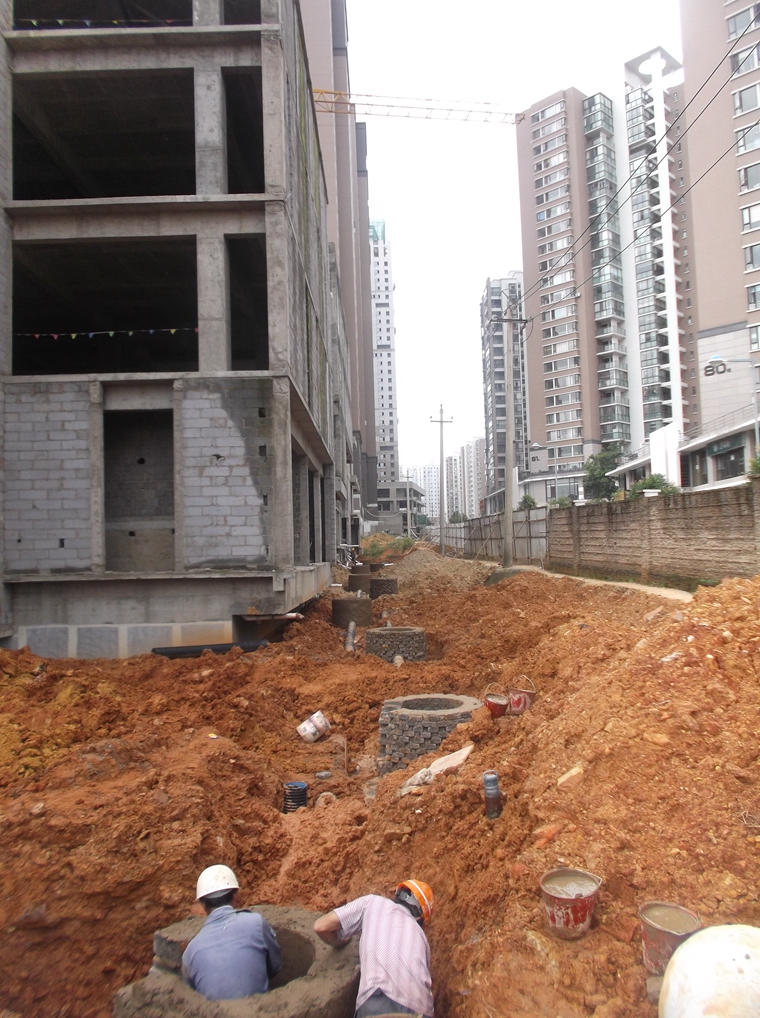 (七)室外雨污管施工:1-2#库完成60%;4#库完成40%;3#库完成10%;2号库至4号库DN1000泄洪管已连通;5号路沿线已完成;13栋、14栋化粪池已安装;5栋后雨、污水支管正在施工。