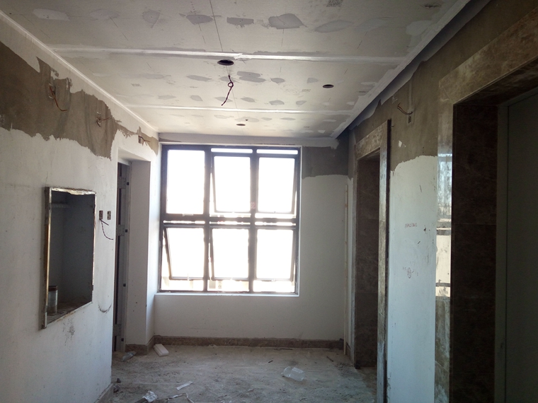 (二)公共部分装修(楼梯间、走道及电梯前室):住宅部分:2、3、4、9、10、11、13、14栋地砖铺贴及墙面第一道腻子大面完成;2、3、4、14栋电梯前室吊顶石膏板封顶已完成。写字楼部分:1栋完成8-12、14-29层地砖铺贴。