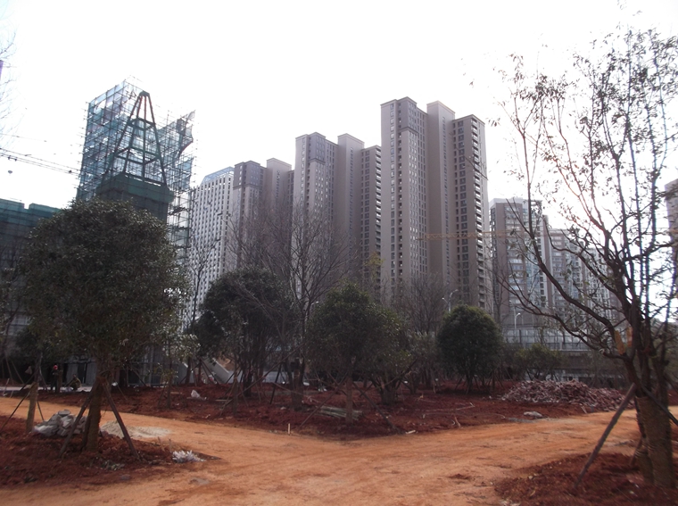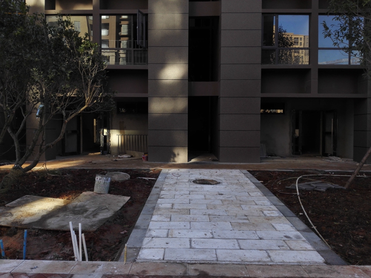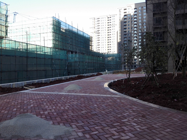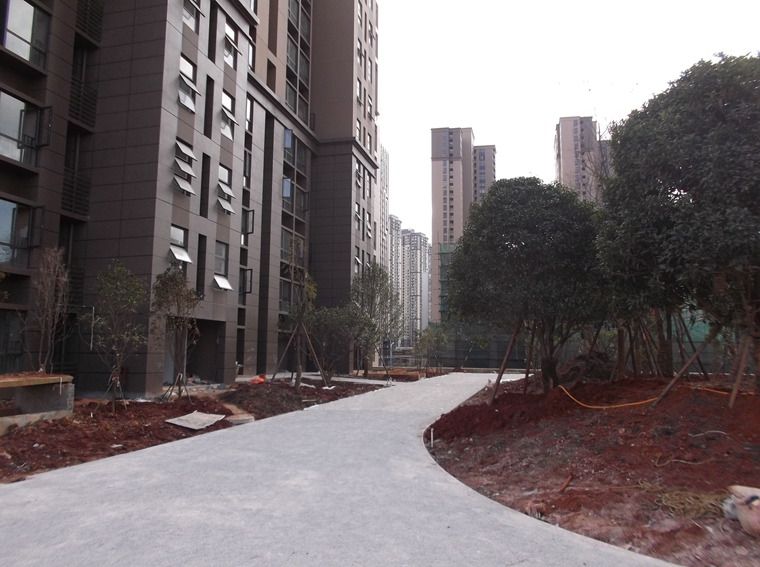 (五)景观:乔木种植完成60%;进红土完成90%;庭院路基完成80%;道路饰面完成20%。